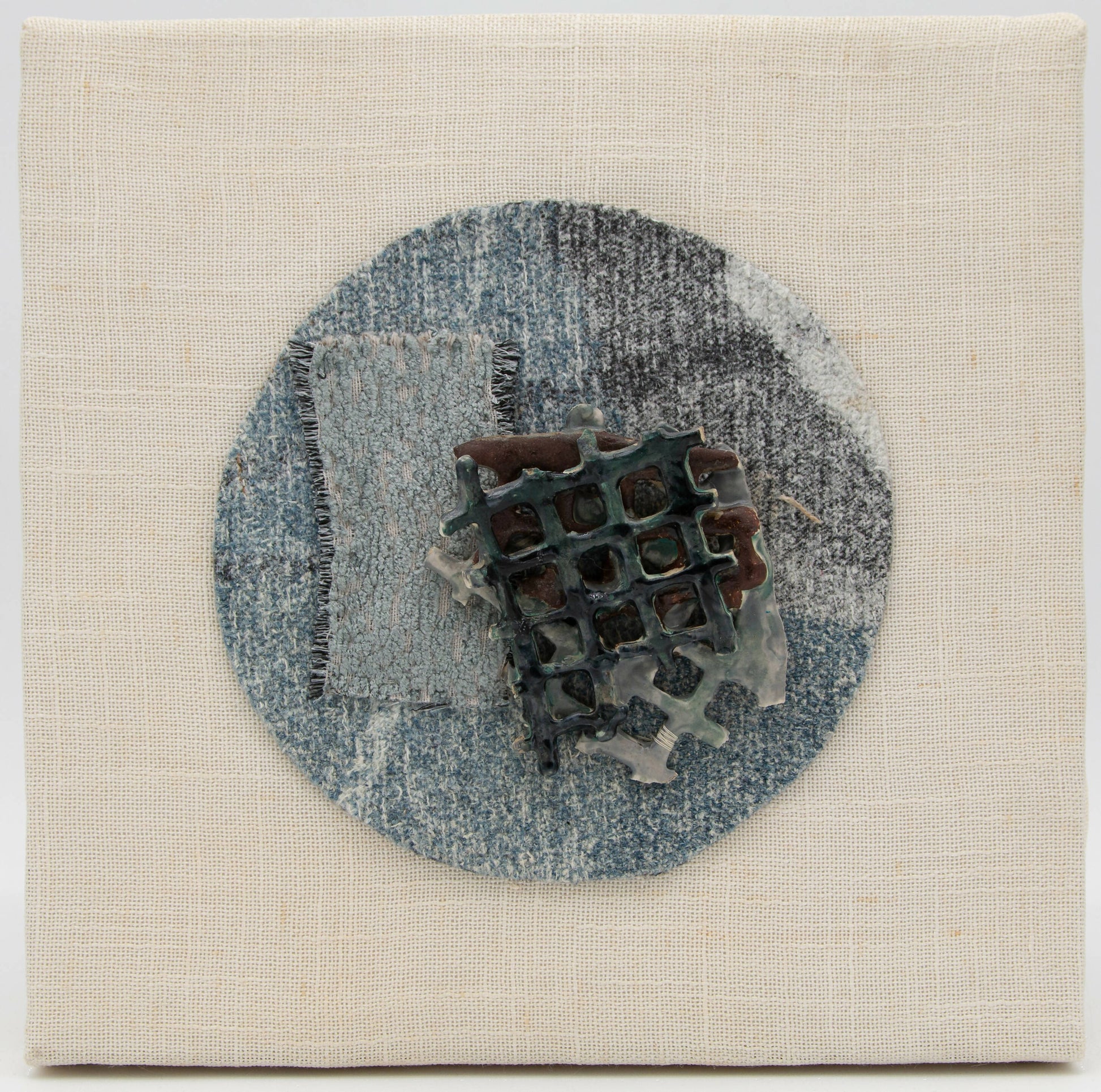 | Mixed medium, glazed ceramics, felted fabric, found fabric, linen, thread mounted on wood |